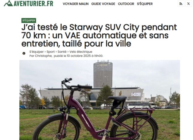 Lors d’un essai de 70 km, Aventurier.fr a mis à l’épreuve le Starway SUV City. Résultat : un vélo électrique “automatique et sans entretien”, qui combine confort, technologie et autonomie pour la ville.