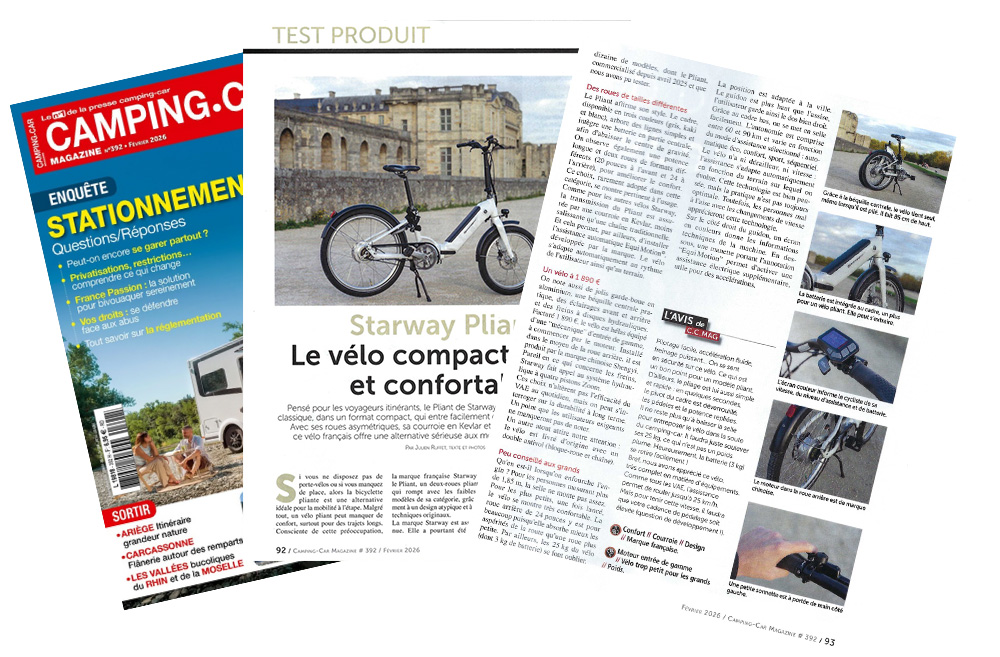 Nous sommes fiers de vous annoncer que le célèbre mensuel Camping-Car Magazine a récemment passé au crible notre Starway Pliant. Dans un dossier dédié aux solutions de mobilité pour voyageurs, nos experts ont testé les performances de ce vélo conçu pour simplifier vos escapades.
