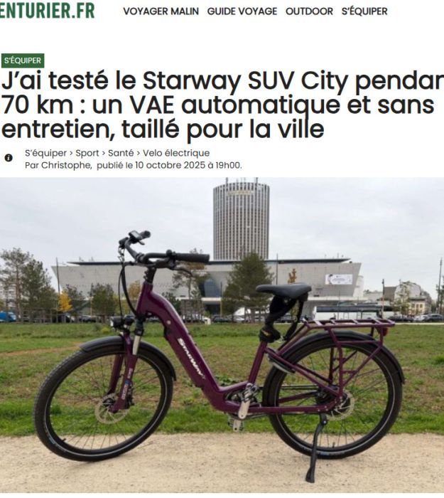Lors d’un essai de 70 km, Aventurier.fr a mis à l’épreuve le Starway SUV City. Résultat : un vélo électrique “automatique et sans entretien”, qui combine confort, technologie et autonomie pour la ville.